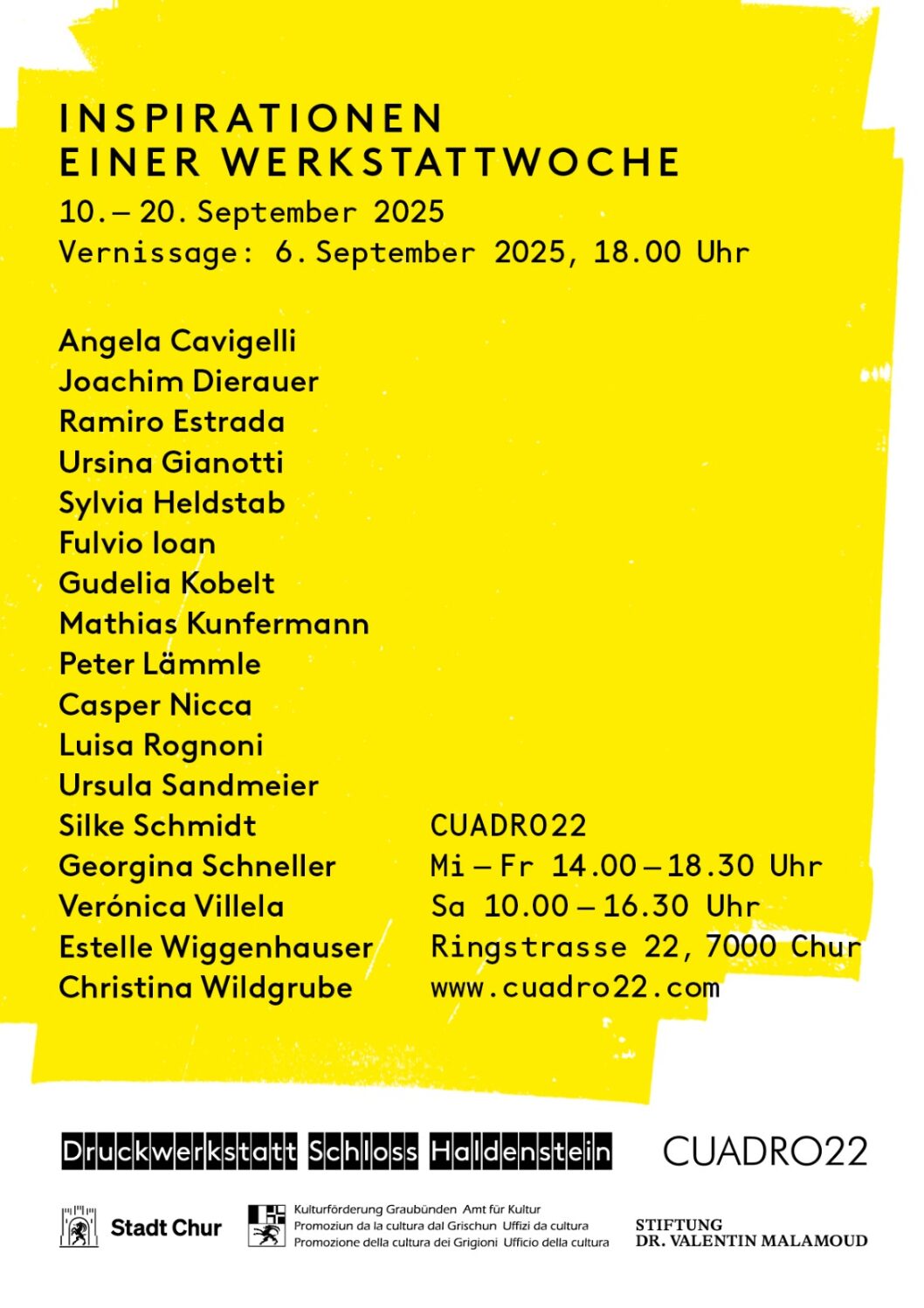 Vom 29. August bis 6. September 2025 öffnete die Druckwerkstatt Schloss Haldenstein ihre Türen für ein intensives, spartenübergreifendes Kunstlabor: 17 Künstler*innen arbeiteten während einer Woche in wechselnden Konstellationen mit verschiedenen manuellen Drucktechniken – darunter Lithografie, Radierung, Siebdruck, Linol- und Holzschnitt, Cyanotypie sowie Photopolymer-Verfahren.